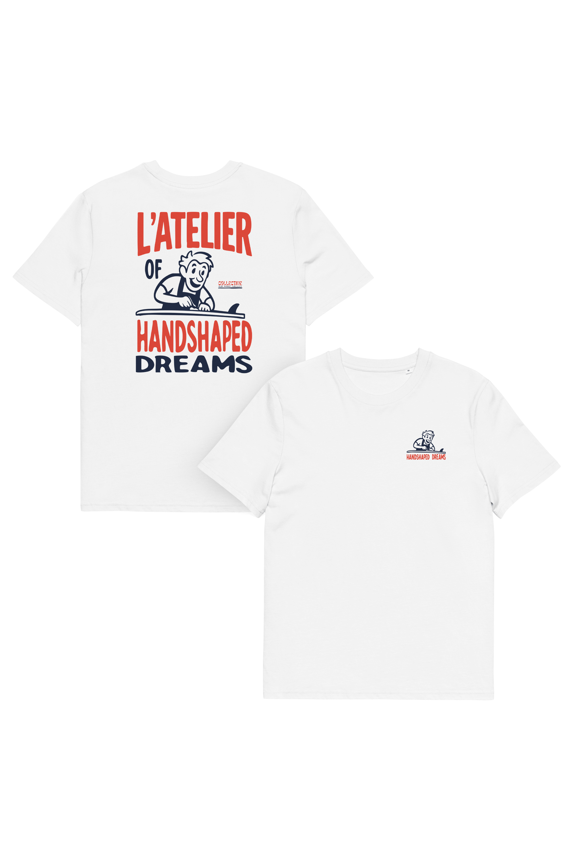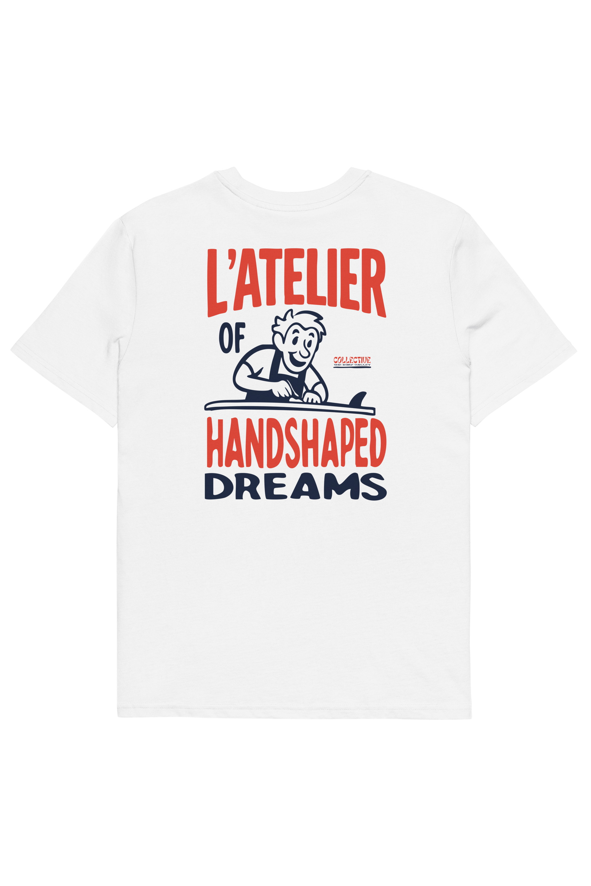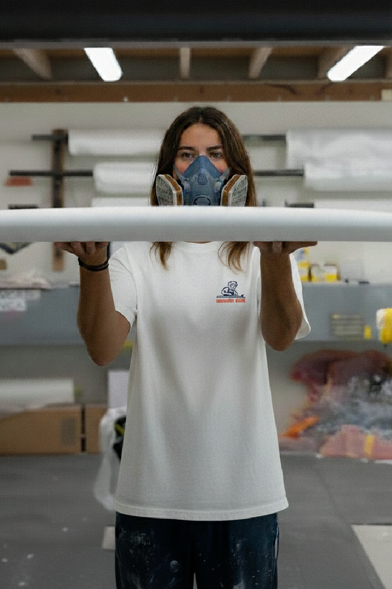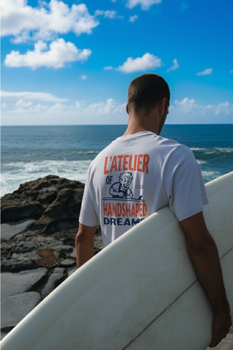 Camiseta inspirada en la magia del shaping artesanal como símbolo de oficio y sueños, recordándonos que cada ola comienza en el taller. Minimalismo gráfico y esencia surf en una pieza atemporal.
