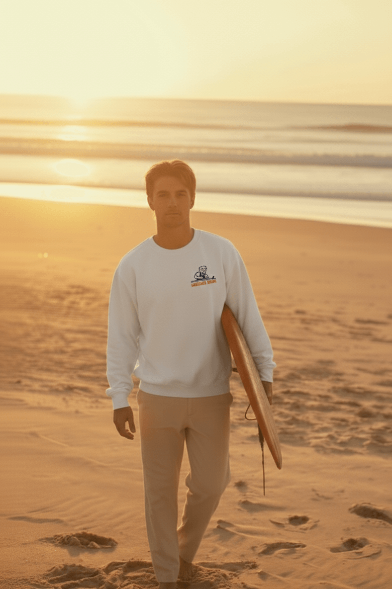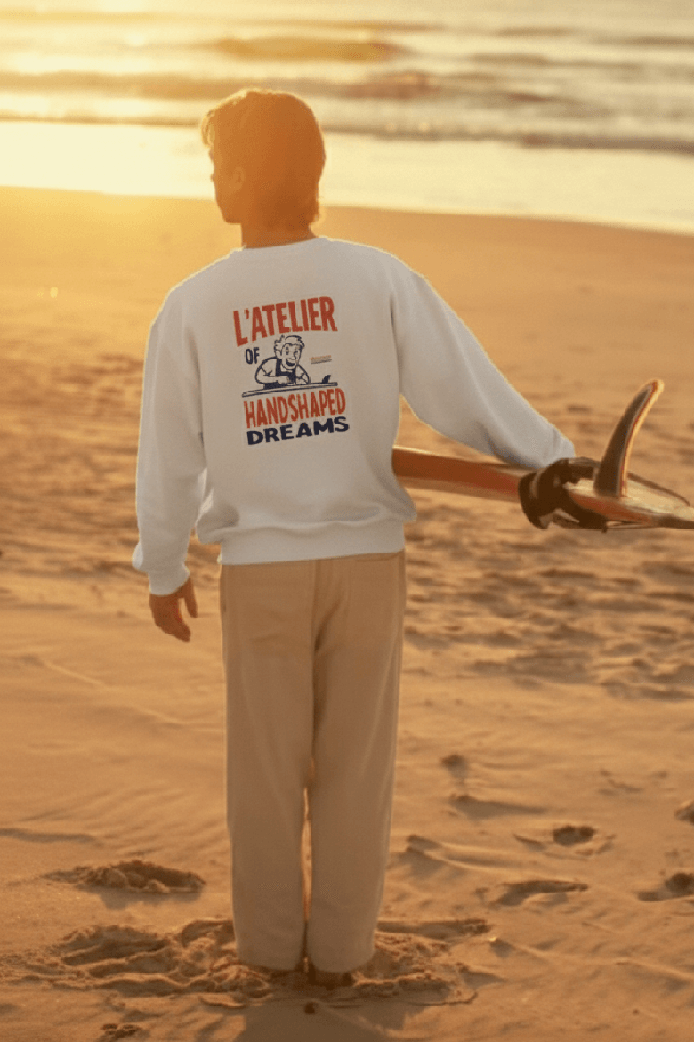 Sudadera inspirada en la magia del shaping artesanal como símbolo de oficio y sueños, recordándonos que cada ola comienza en el taller. Minimalismo gráfico y esencia surf en una pieza atemporal.